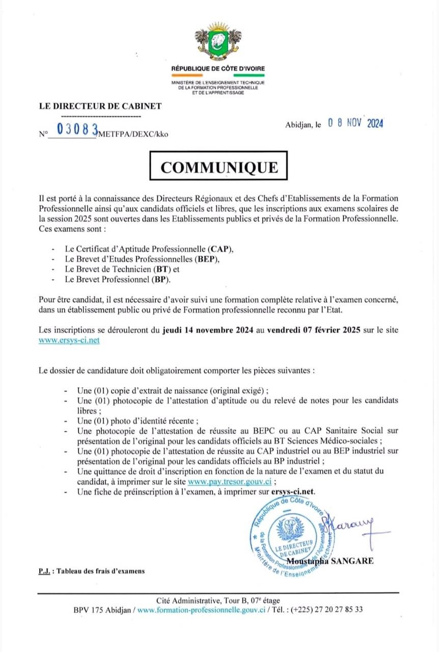 Les inscriptions aux examens scolaires de la session 2025 sont ouvertes dans les Établissements publics et privés de la Formation Professionnelle. Ces examens sont :
